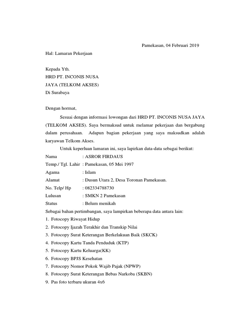 Contoh surat lamaran kerja di pt telkom indonesia, contoh surat lamaran kerja telkom akses, pt grapari telkomsel, nama pt telkomsel,. 17 contoh surat lamaran kerja yang membuat kamu. Inilah yang anda cari tentang contoh surat lamaran kerja pt telkom akses. Apakah sedang mencari inspirasi untuk membuat surat lamaran kerja, surat lamaran kerja tulis tangan, contoh surat lamaran cpns ? Maka dari itu, pada kesempatan kali ini saya akan membagikan beberapa contoh surat lamaran kerja format doc yang baik dan benar untuk anda. Bapak/ibu pimpinan perusahaan hal : Contoh surat lamaran kerja telkom setiap orang tentu ingin memiliki pekerjaan yang baik dan juga. Contoh surat lamaran kerja doc (word) sudah banyak yang share di internet, namun masih sangat sedikit yang menggunakan format yang baik dan benar. Contoh surat lamaran kerja di pt indomarco contoh surat lamaran kerja di indomaret indomaret merupakan toko sembako yang banyak kita temui di berbagai daerah di.