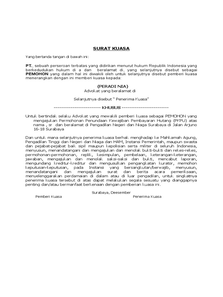 Contoh Surat Kuasa Peninjauan Kembali Perdata.