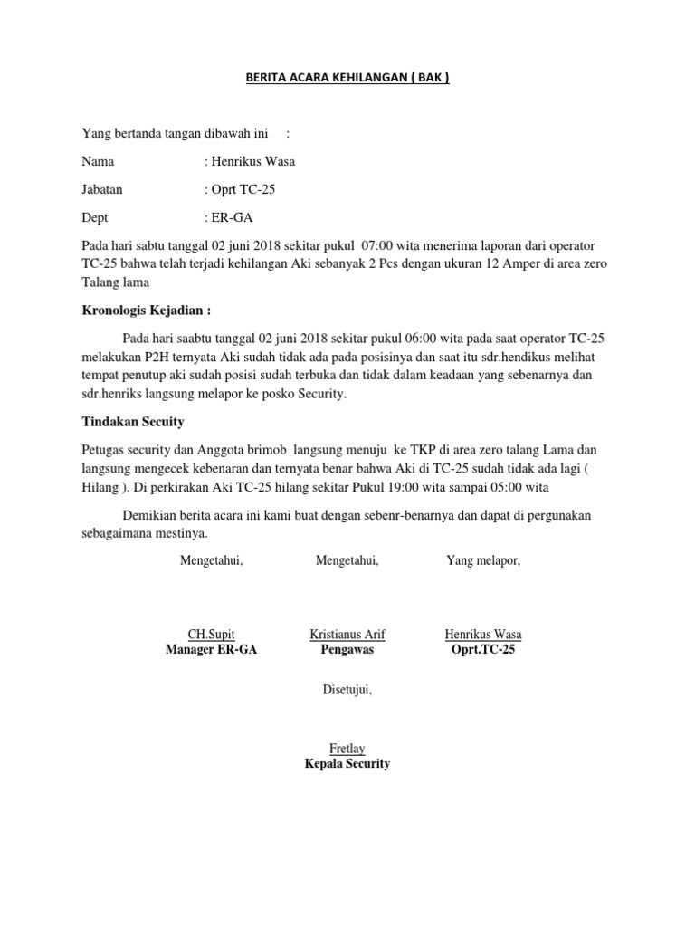 Yang menyatakan kehilangan, dedi setiawan. Cara mengurus surat tanah yang hilang cermati. Berita acara kejadian juga bisa menerangkan tentang kejadian kecelakaan baik ditempat kerja maupun umum hingga kejadian. 17 bab iii pembahasan a tinjauan umum 1 gambaran umum perusahaan. 3.88 x 9.2 m, frontlite korea tanpa sambung (so003003), dengan nilai rp. Peraturan kepala kepolisian negara republik indonesia nomor 7 tahun. Sederhananya, berita acara ini biasanya mempunyai fungsi sebagai bukti legal suatu kejadian atau transaksi tertentu. 1 daftar barang hilng dalam kondisi rusak berat dan direklas menjadi aset lainnya no. Ada banyak jenis dan contoh berita acara yang digunakan untuk. Contoh berita acara kehilangan barang kantor temblor en.