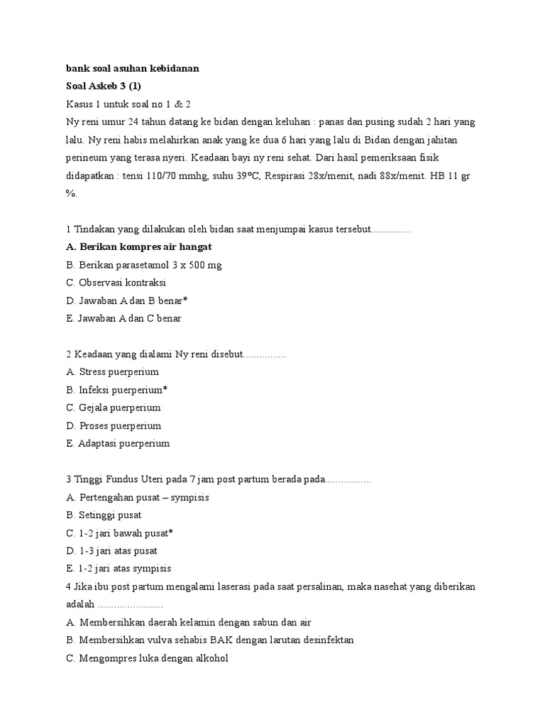 Menentukan diagnosa dan kebutuhan asuhan kebidanan dalam masa persalinan. Panas dan pusing sudah 2 hari yang lalu. Apa saja syarat standart pelayanan kebidanan ? Memberikan alur berpikir dalam pemecahan masalah atau pengambilan keputusan klinis d. Bank soal asuhan kebidanan soal askeb 3 (1) kasus 1 untuk soal no 1 & 2 ny reni umur 24 tahun datang ke bidan dengan keluhan : Panas dan pusing sudah 2 hari yang lalu. Contoh soal ujian patologi soal ujian i. U umur 36 th gvii pv ai, segera setelah plasenta lahir lengkap terjadi perdarhan, kontraksi uterus lembek serta tfu sulit di temukan. 6.apakah pengendalian kelahiran diperlukan selama kehamilan?