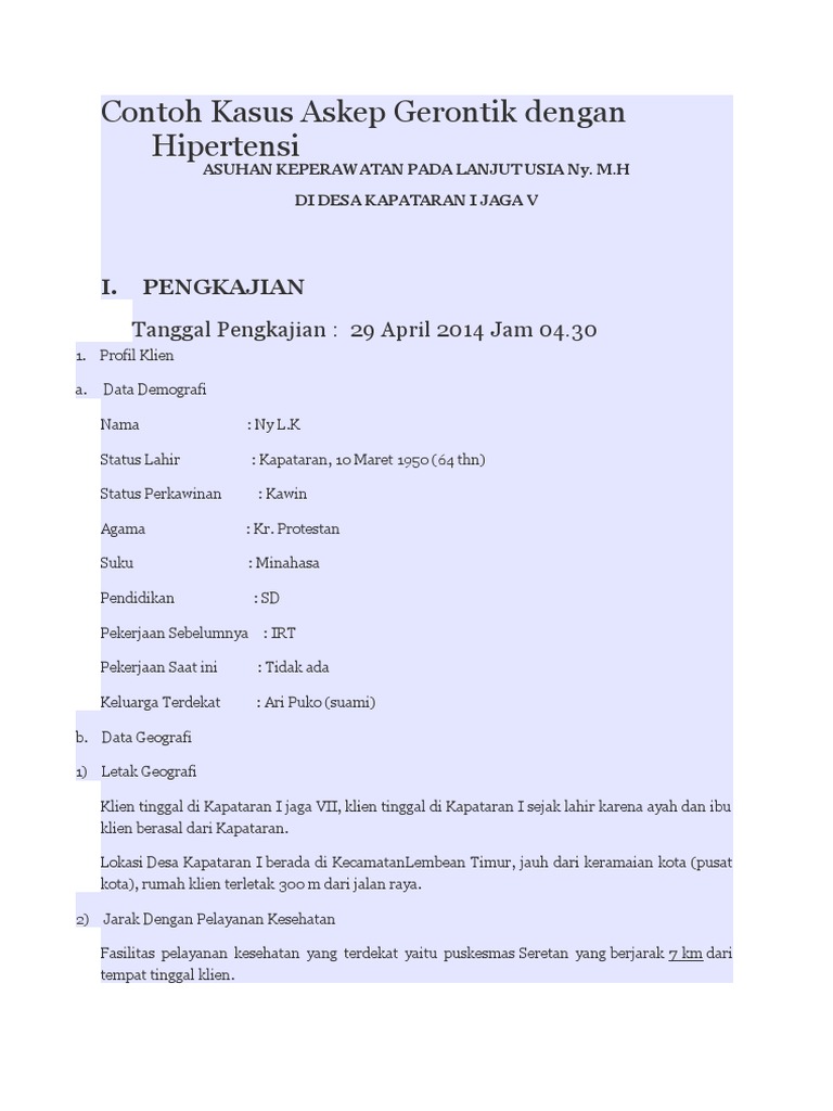 Contoh kasus askep gerontik dengan hipertensi asuhan keperawatan pada lanjut usia ny. Dia tidak bekerja di luar rumah. Hipertensi dengan perbandingan 26,6% pria dan 26,1% wanita. Latar belakangjumlah penduduk lansia makin meningkat, sementara itu penurunan kemampuan fisik dan mental lansia berpengaruh terhadap aktivitas sosial ekonominya. Gerontik october 27, 2020 laporan evidence based practice (ebp) keperawatan gerontik. Contoh format pengkajian lansia , gerontik format pengkajian individu lansia. Tekanan darah pada penderita hipertensi terkhusus lanjut usia. Jumlah penduduk lansia di seluruh dunia pada tahun 2008 mencapai 425 juta jiwa atau 6,8% dari seluruh jumlah penduduk. Hipertensi dapat didefinisikan sebagai tekanan darah persisten dimana tekanan sistoliknya di atas 140 mmhg dan diastolik di atas 90. Hipertensi adalah penyakit yang dapat menyerang siapa saja, baik.
