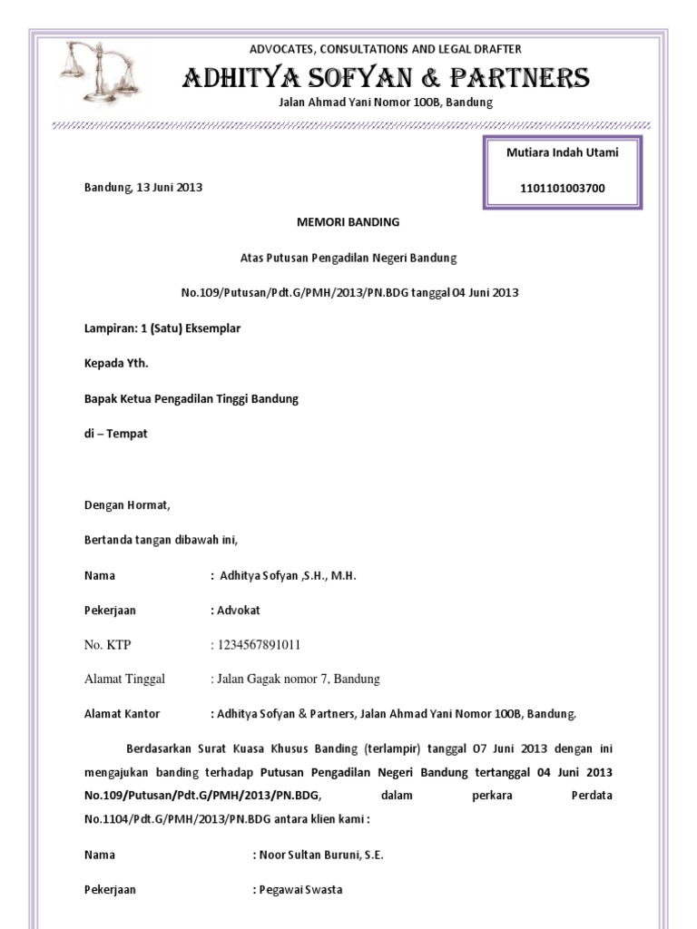 Menyerahkan berkas banding kepada meja iii. Contoh memori banding kantor advokat fadilla mariska putri s h m h dan partners sk menteri kehakiman hak asasi manusia ri no d 209 kp 05 12 th 2005 jl course hero. 03/pdt.g/2009/pn.srln tanggal 10 september 2009 antara : Bahwa putusan aquo sudah tepat dan benar menurut hukum, sehingga adalah berdasarkan hukum untuk dikuatkan oleh pengadilan tinggi _____; Kepada yang terhormat, ketua pengadilan tinggi yogyakarta. Bahwa pengadilan tinggi tun jakarta telah memutus perkara nomor : Bahwa memori banding pembanding tersebut telah diberitahukan kepada terbanding pada tanggal 09 juli 2018, terhadap memori banding tersebut terbanding telah mengajukan kontra memori banding pada tanggal 20 juli 2018 yang diterima di kepaniteraan pengadilan tinggi agama bandung Dan kontra memori banding ini pada hakekatnya. Perusahaan listrik negara (pln) sub ranting batang asai, berkedudukan di desa pekan gedang, kecamatan batang asai, kabupaten sarolangun, provinsi jambi, semula sebagai turut.